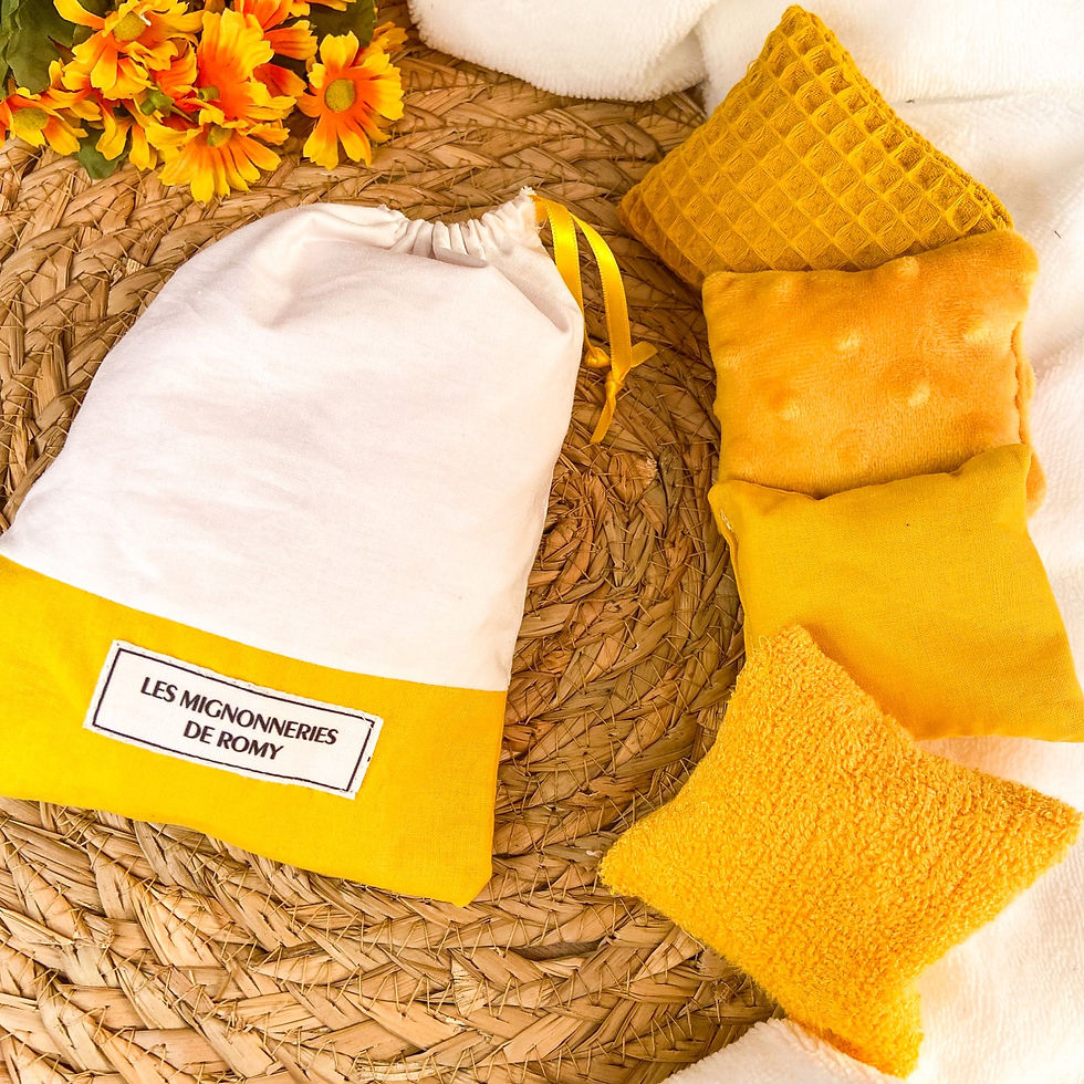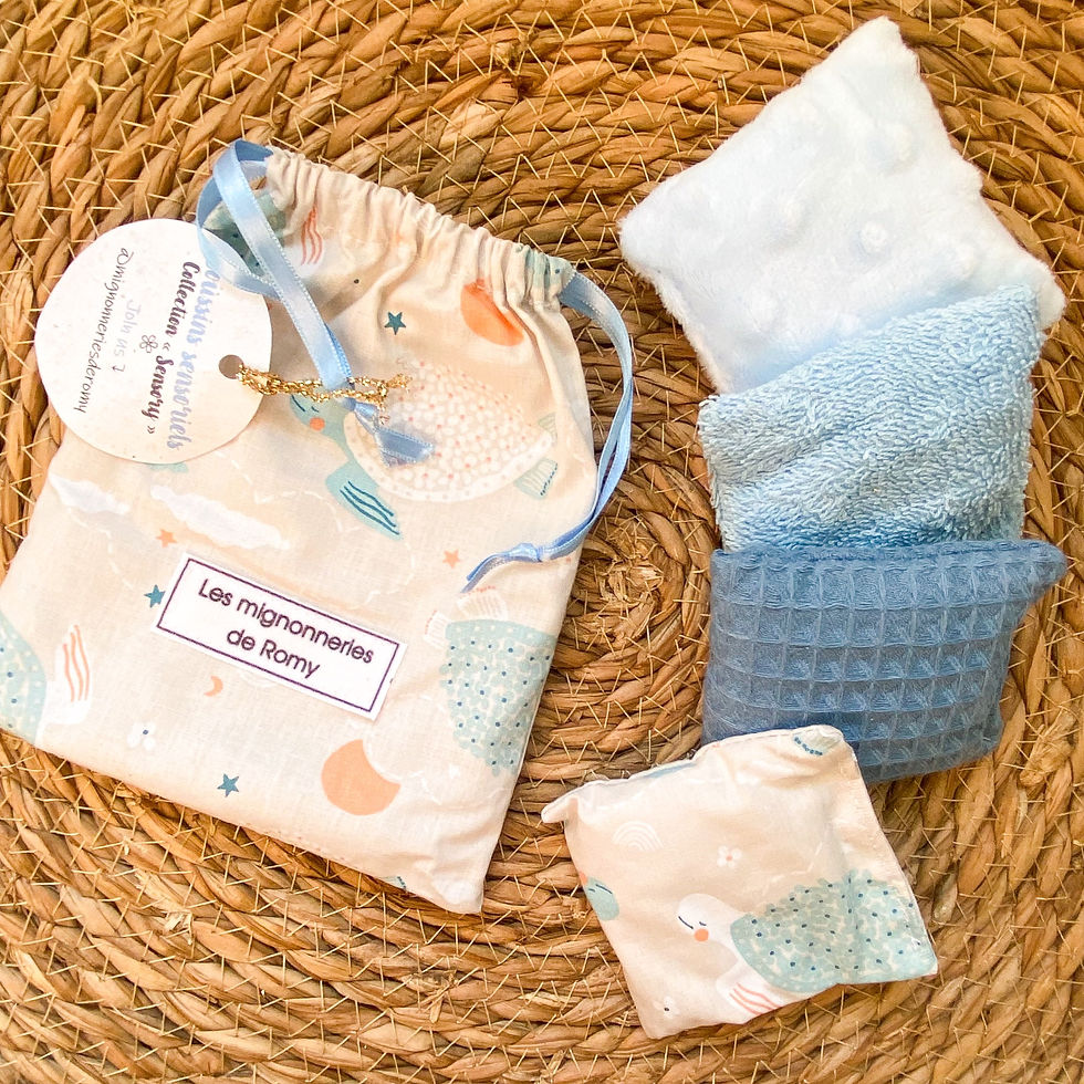 Les coussins sensoriels sont une activité d'inspiration Montessori. Ils s'agit de petits coussins de matières et textures différentes afin de développer la motricité fine et éveiller le sens du toucher de votre bébé. Grâce aux Sensory personnalisés, bébé pourra apprendre à composer son prénom et découvrir les chiffres. La personnalisation des coussins est un concept original que vous ne trouverez nulle part ailleurs !